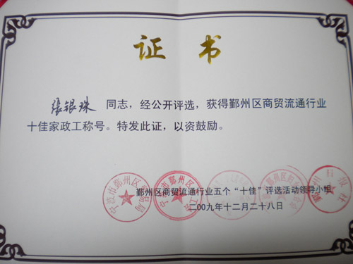 熱烈祝賀本公司員工 張銀珠 被評為寧波市鄞州區商貿流通行業十佳家政工稱號!!
