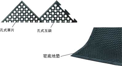 膠墊的表面設(shè)計(jì)能給予最大的摩擦力和安全性,起到防滑、抗疲勞、耐磨、抗菌;其斜邊則使人不容易絆倒。底部吸盤有效提高地墊位置,改善排水,使工人的腳底保持清潔干爽,適合用于不同的濕滑場合,如:廚房、廠房、通道等。 </td> 尺寸: 3’x 5’(93cm x154cm) 顏色: 黑色 孔式地墊厚度: 1/2”(1.27cm) 7/8”(2.22cm) 密底地墊厚度: 1/4”(0.63cm)