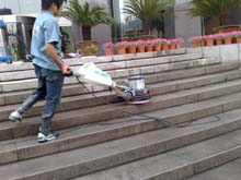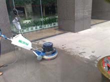 二、花崗石翻新:花崗石主要由石英、長石、角閃石、輝石、橄欖石、云母等礦物成分組成。莫氏硬度在6度以上,肖氏硬度在60—90之間,光澤及顏色與所含礦物成分有很大關(guān)系,可謂千變?nèi)f化。因此在翻新時要多加研究,在機(jī)器轉(zhuǎn)速、壓力和磨料成分上要有針對性,工人操作的經(jīng)驗(yàn)在可否達(dá)到預(yù)期效果上有至關(guān)重要的作用。花崗巖硬度高,研磨難度大,出光同時出色的難度更大,如果對具體石體不分析不試驗(yàn),有再好的機(jī)器也磨不出好的、特別是整體的效果。因此,具體試驗(yàn)(有時要做二、三次)是做好花崗翻新的必要前題。 一棟現(xiàn)代化的大樓,除了本身完美的結(jié)構(gòu)設(shè)計(jì)引人注目外,用天然石材裝飾的內(nèi)外墻及地面因其自然的美也己成為都市建筑中一道獨(dú)特的風(fēng)景線。然而近年來由于自然環(huán)境的惡化,塵埃、工業(yè)廢氣、酸雨等極易污染石材,繼而產(chǎn)生水斑不干、白華、吐黃、銹斑等石材頑癥,加速石材的劣化。因此如何長期保持建筑石材天然亮麗的外觀,己成為建筑設(shè)計(jì)師、建筑公司及業(yè)主三方面首要考慮的問題之一。