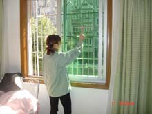 1、玻璃:先用濕毛巾將窗框上的灰塵擦拭干凈,再用涂水器沾稀釋后的玻璃水溶液,均勻的從上到下涂抹玻璃,后用雙面玻璃清潔器從上到下刮干凈,用干毛巾擦凈框上留下的水痕,同時用報紙擦凈玻璃上的水印。著重之處:框縫吸塵,擦拭。